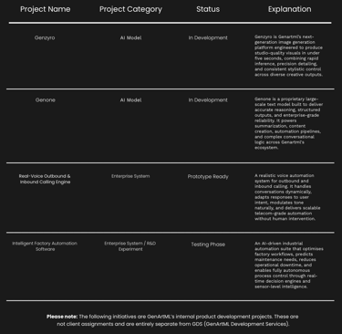 Please note: The following initiatives are GenArtML’s internal product development projects. These are not client assignments and are entirely separate from GDS (Genartml Development Services).