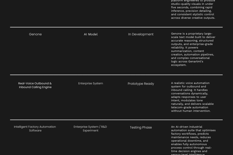 Genone is a proprietary large-scale text model built to deliver accurate reasoning, structured outputs, and enterprise-grade reliability. It powers summarization, content creation, automation pipelines, and complex conversational logic across Genartml's ecosystem.